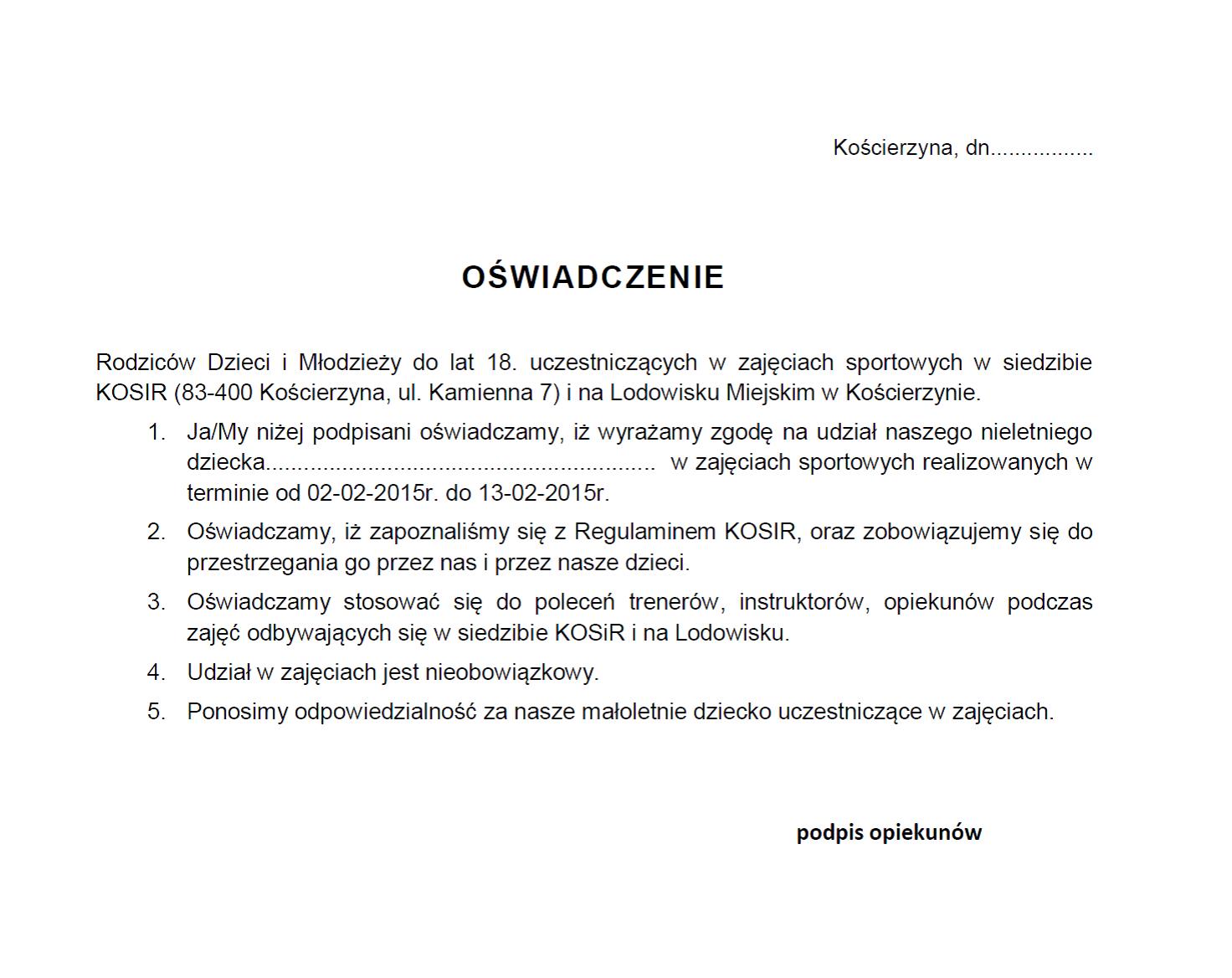 Ilość miejsc ograniczona, dlatego zachęcamy do wcześniejszych zapisów. Wymagane jest oświadczenie rodziców/opiekunów wyrażające zgodę na uczestniczenie dzieci w zajęciach w ramach Sportowych Ferii Zimowych - Pobierz